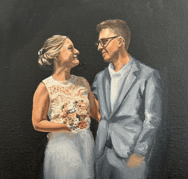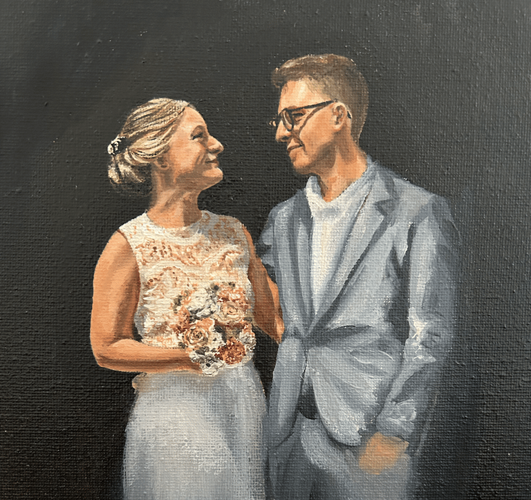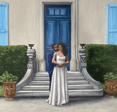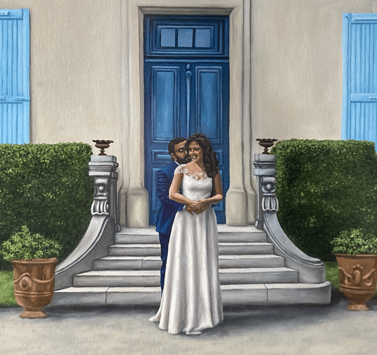 Cette formule vous permet de capturer l'instant magique de votre mariage en direct. Je peins votre portrait avec en toile de fond le lieu où vous avez choisi de célébrer votre union, que ce soit un cadre naturel, une salle de réception élégante ou un lieu chargé d’histoire.